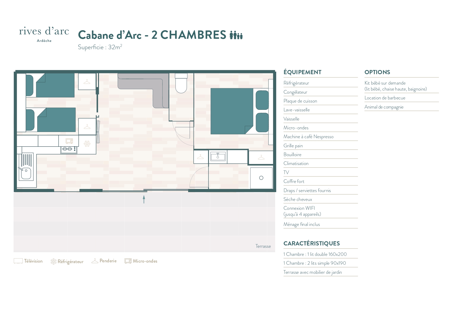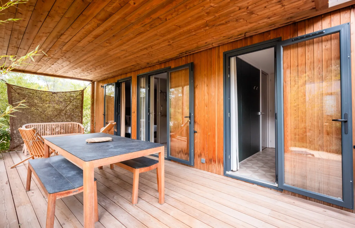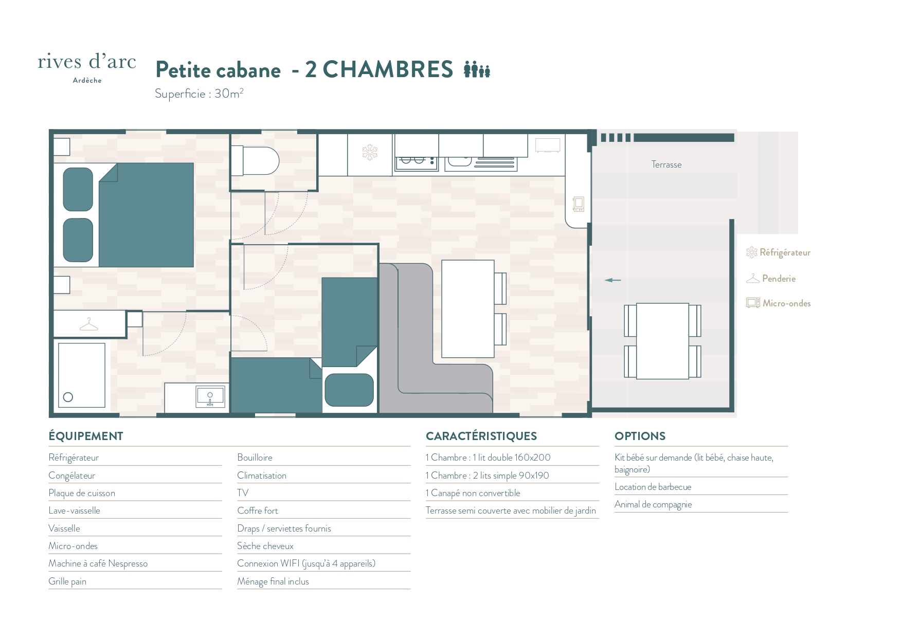 Rives d’Arc biedt met de Cabanes d’Arc een niet alledaagse accommodatie waarin u kunt wegdromen in een andere wereld. De houten gevelbekleding laat de Cabanes d’Arc opgaan in het groen. Het harmonieuze ontwerp verbindt met de natuur. Dankzij de grote schuifpui en het terras staan zon en groen centraal tijdens uw vakantie.