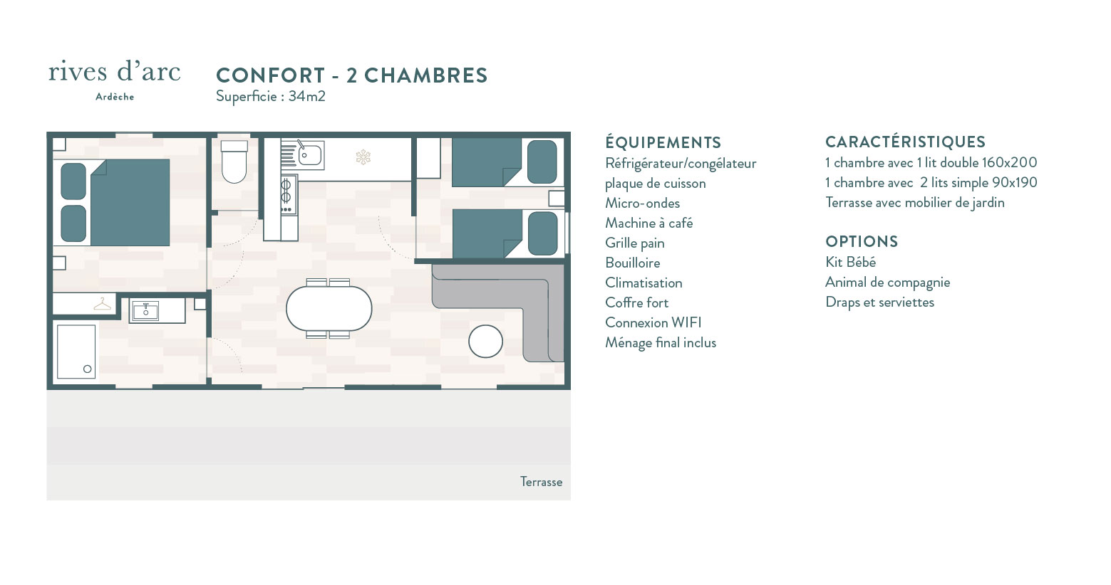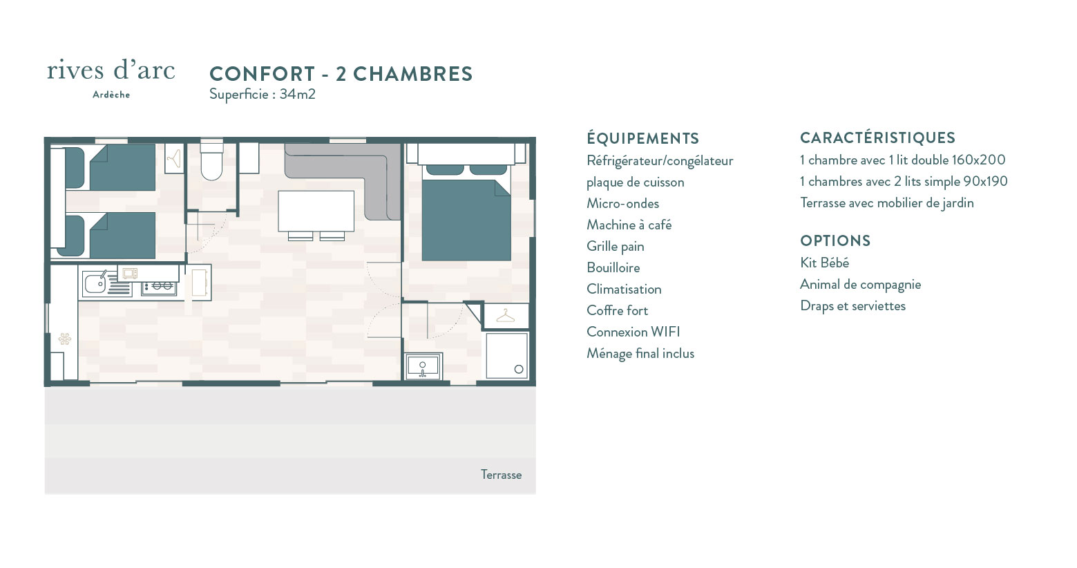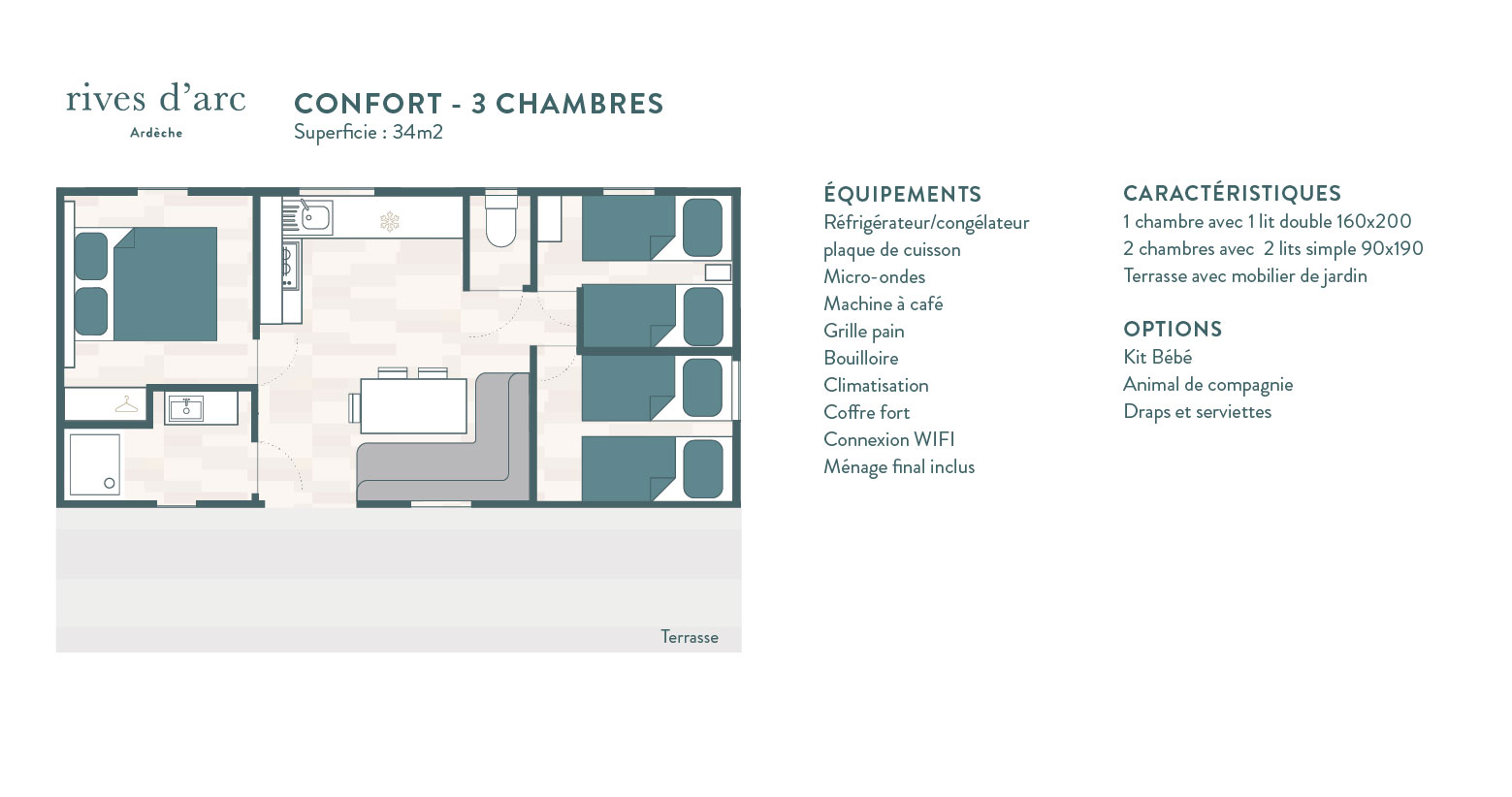 Camping Rives d’Arc biedt moderne stacaravans aan met een terras met tuinmeubilair en alle voorzieningen voor een aangename vakantie in het hart van de Ardeche.