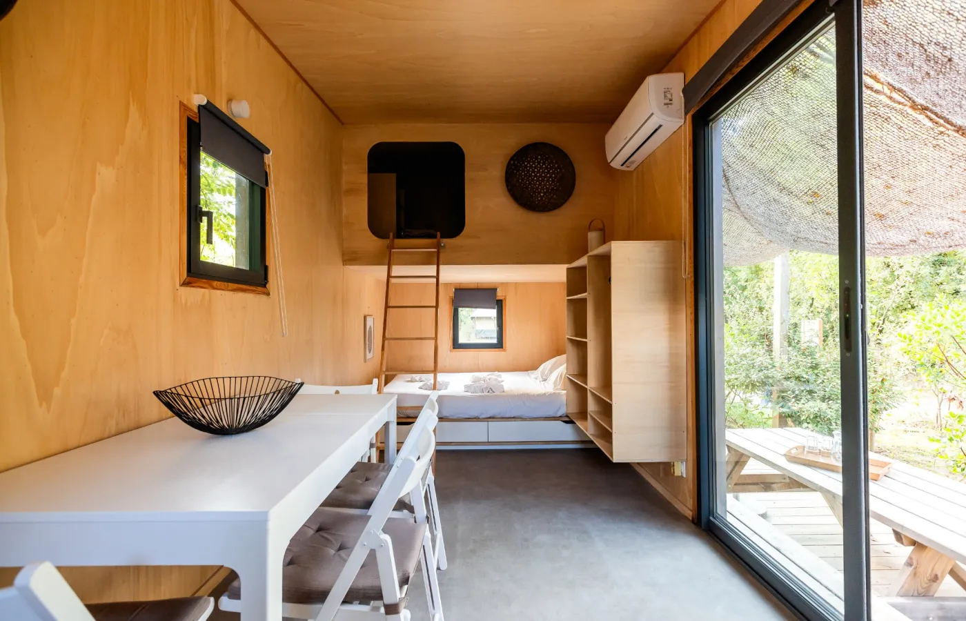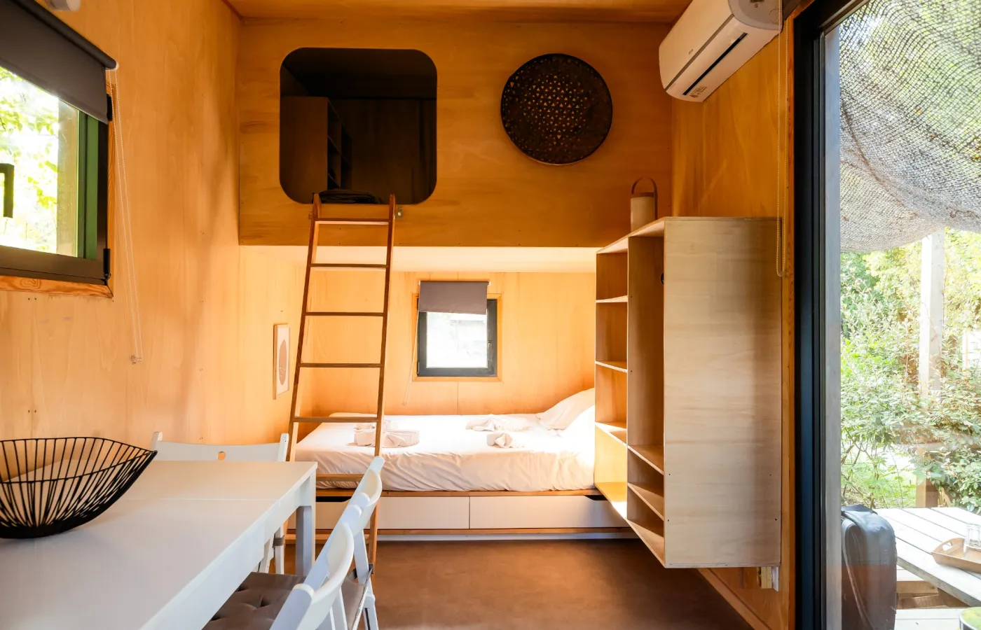 1 tweepersoonsbed 160x200 2 eenpersoonsmatrassen 80x190 op de mezzanine Eigen douche & toilet binnen